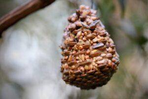 Für euer Vogelfutter benötigt ihr folgende Zutaten: trockene, geöffnete Tannenzapfen, Kokosfett, eine Körnermischung, Haferflocken, gehackte Nüsse und Leinsamen. Das Kokosfett wird langsam in einem Topf bei niedriger Hitze geschmolzen. Sobald es flüssig ist, wird die Körnermischung hinzugegeben und alles vermengt. Nun wird die Masse in die Zwischenräume der Tannenzapfen gedrückt. Am besten gelingt dies mit einem Löffel oder den Fingern. Anschließend befestigst ihr eine stabile Schnur am oberen Ende des Zapfens, um ihn aufhängen zu können. Die fertigen Zapfen sollten kurze Zeit im Kühlschrank oder draußen bei kühlem Wetter aushärten, bevor sie im Garten oder auf den Balkon zum Einsatz. Achtet darauf, dass der Platz, an dem ihr eure Zapfen aufhängt, möglichst wettergeschützt und katzensicher ist. Wir wünschen euch viel Spaß beim Herstellen und beim Vögel beobachten.