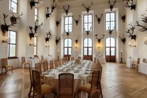 Doch auch außerhalb der Sonderausstellung gibt es viel zu sehen: prachtvolle Räumlichkeiten aus der Zeit, als das Schloss als kurfürstliches Jagd- und Lustschloss diente, allen voran das eindrucksvolle Federzimmer. Dessen Wände sind mit kunstvoll in Handarbeit gestalteten Federtapeten geschmückt und ein europaweit einzigartiges Kunstwerk, das bis heute fasziniert. Ein weiterer Höhepunkt ist die große Sammlung historischer Jagdtrophäen, die zu den bedeutendsten Europas zählt. Sie zeigt nicht nur die Leidenschaft der sächsischen Herrscher für die Jagd, sondern vermittelt auch ein lebendiges Bild höfischer Traditionen. Beim Rundgang durch die Säle begegnen den Besucherinnen und Besuchern außerdem prächtige Gemälde, kunstvolle Waffen, prunkvoll eingedeckte Tafeln und zahlreiche Objekte, die das Leben am Hofe Augusts des Starken greifbar machen.