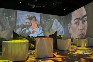 Unser Fazit: Wer Frida Kahlo bisher nur aus Büchern oder klassischen Ausstellungen kannte, erlebt hier eine völlig neue Kombination aus Kunst, Emotion und moderner Projektionstechnik, die auch für Kinder geeignet ist. Besonders spannend für jüngere Besucher sind die vielen Tiere und Symbole, die in Frida Kahlos Werken immer wieder auftauchen: Affen, Vögel, Blumen oder Fantasieelemente, die in der 360‑Grad‑Projektion groß und lebendig erscheinen und Kinder intuitiv ansprechen. Einziger limitierender Faktor der Ausstellung mag die Preisgestaltung sein (Erwachsenen-Flex-Ticket 29 Euro, Kind-Flex-Ticket 25 Euro). Hier erhaltet ihr mehr Informationen zu Viva Frida Kahlo – Immersive Experience.